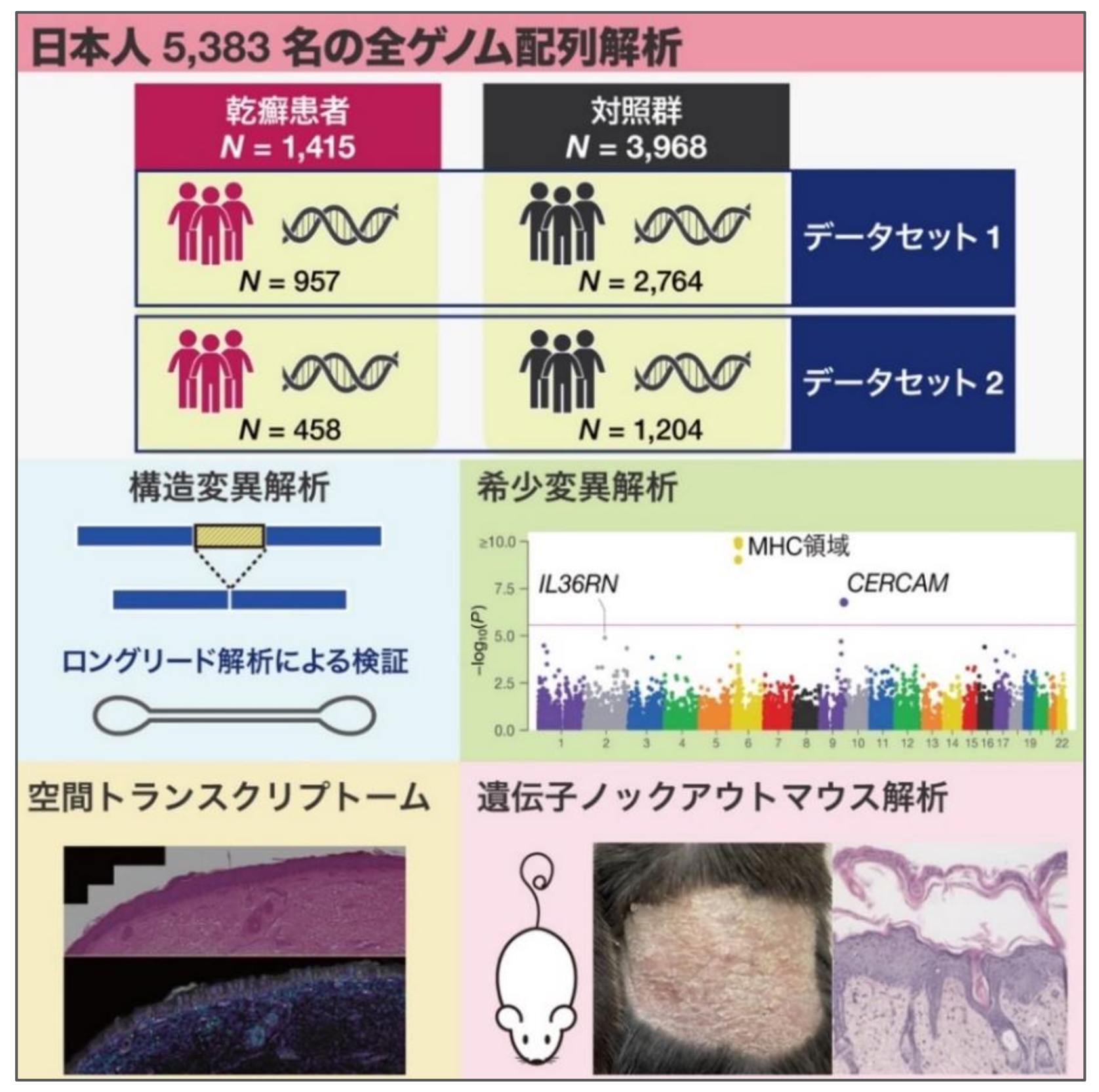 乾癬は、皮膚の新陳代謝のスピードが異常に速くなることで起こる慢性的な皮膚の病気です。皮膚では通常、約1カ月をかけて内側で生じた新しい細胞と表面から剥がれ落ちる古い細胞が入れ替わります。ところが、乾癬では、数日ほどに短くなるため、古い皮膚がはがれきれずにどんどん積み重なって、皮膚が赤くなる、表面が白くかさかさしてはがれ落ちる、かゆみを伴うといった症状が現れます。乾癬には、生まれつきの体質の影響が大きいことがわかっていて、これまでにゲノムワイド関連解析(GWAS)により、多くの遺伝子が乾癬と関係していることが報告されています。しかし、これらの関係している遺伝子を調べても、原因は明らかになっていませんでした。