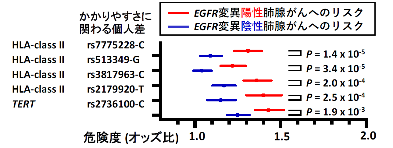 肺腺がんは日本人の肺がんの中で最も発症頻度が高く、またその死亡率も全がん種の中で最も高い疾患です。一般的に肺がんは喫煙などの環境要因が発がんに強く関連することが知られています。しかし肺腺がんでは、全患者の約半数が非喫煙者で、特に女性や若年層で喫煙と関係なく発症するケースが比較的多いことが報告されています。また日本人の肺腺がん患者の約半数がEGFR遺伝子に変異を持つ(欧米系では10%程度)など、日本人の肺腺がん発症リスクに遺伝的な要因が関わることが明らかになってきています。