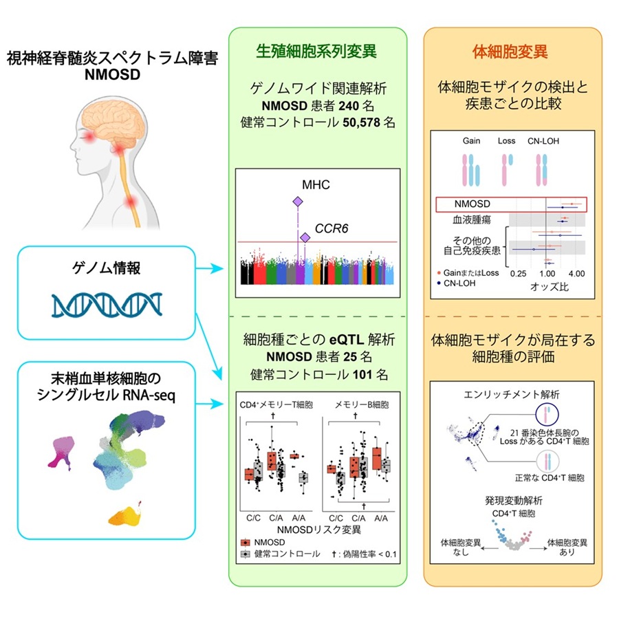 免疫系が自分の視神経や脊髄を攻撃してしまい、視力低下や手足マヒなどが生じる視神経脊髄炎スペクトラム障害という疾患があります。10万人あたりの患者数は欧州で約1人、東アジアで約3.5人と少なく、体内で何が起きているか詳しくわかっていません。ほかの自己免疫疾患では生まれながらの遺伝的体質や、免疫系を担う白血球に加齢とともに生じた遺伝子の変化が発症のリスクを高めることが知られています。そこで、大阪大学、九州大学などの研究グループは、遺伝的体質と後天的に生じた白血球の遺伝子の変化の両面から、視神経脊髄炎スペクトラム障害の発症リスクを高める要因を探りました。